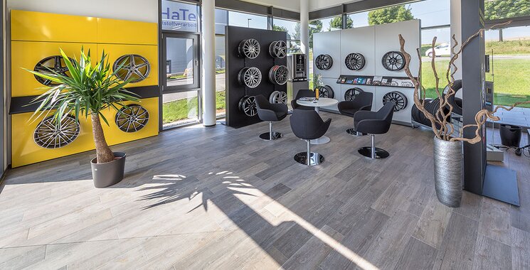 Der Gesamteindruck im Verkaufsraum ist tatsächlich perfekt. „Wir werden oft auf die Fliese angesprochen, sie ist wirklich super, super, super“, freut sich der zufriedene Fliesen-Kemmler-Kunde. Als durchgefärbtes Feinsteinzeug ist der Boden unempfindlich und robust. Außerdem betone die Reinigungsmannschaft immer wieder, dass die Fliese sehr reinigungsfreundlich sei. Optik und Handling stimmen, der Service durch Fliesen-Kemmler auch: Das sei alles, lacht Morreale, was ein erfolgreiches Geschäft ausmache – „genau wie beim Reifenkauf.“