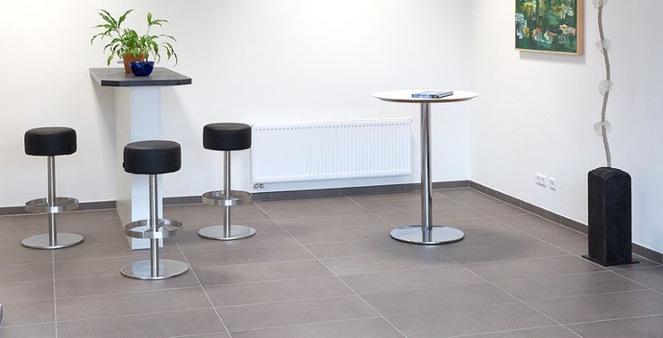 Der Facility Manager von IST METZ kennt die Fliesen-Expertin seit Jahren und vertraut ihr blind. Das mittelständische Unternehmen entwickelt, produziert und vertreibt UV-Anlagen zum umweltfreundlichen Härten von lösemittelfreien Farben, Lacken, Silikonen und Klebern. Rund 350 Menschen sind heute bei IST METZ beschäftigt, darunter viele in der Produktion, die auch im neuen Gebäude viel Platz einnimmt. Wichtig war daher eine schmutzunempfindliche Fliese, bevorzugt in Grau wie die Fliesen in den anderen IST-Gebäuden.