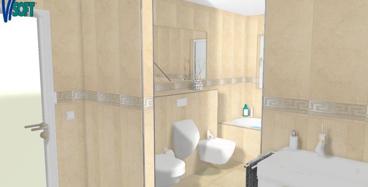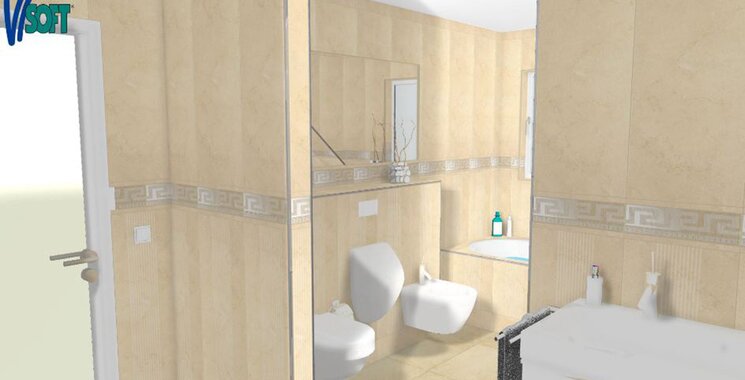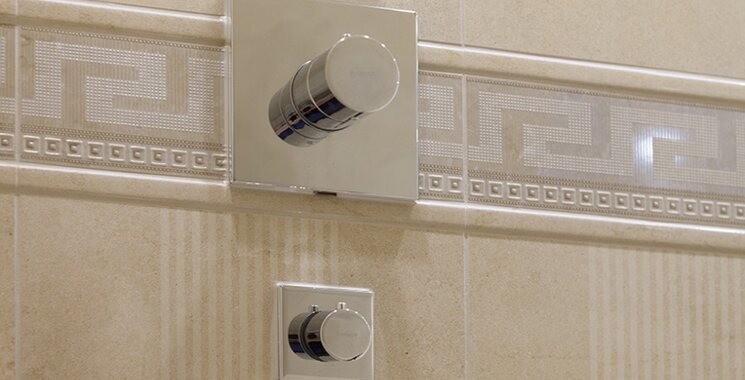 „Wir sind richtig zufrieden,“ bestätigt das Ehepaar. Alle Wünsche sind erfüllt. Großformatige Bodenfliesen mit kalibrierten Kanten sorgen für ein homogenes Verlegebild – dank Wedi-Rinne bis in die Dusche hinein. Sie stammen aus der Serie Catania, die zusätzlich eine hohe Rutschhemmung und dadurch ein Plus an Sicherheit bietet. Den großen Charme der eleganten Wellnessoase macht jedoch die Wandgestaltung aus. Die Komposition aus hochglänzendem Grundmodell, Dekorfliese mit Streifen und klassischer Fliesen Bordüre im Mäander-Design verleiht dem Raum einen Hauch von antikem Marmorbad und modernem Dubai-Feeling. „Luxus ja, aber nicht aufdringlich,“ fasst die Beraterin das Konzept zusammen. Die Kunden hat es überzeugt: „Das Bad ist wunderschön geworden. Alles hat tiptop geklappt und wir sind einfach nur glücklich damit.“