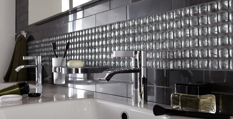 Glasmosaik Fliesen sorgen vor allem an Wänden für einen echten Hingucker und schaffen sowohl im Bad als auch in der Küche und in Wohnbereichen eine interessante Optik. Sie lassen sich ganzflächig oder punktuell anbringen. Räume wirken mit Glasmosaik Fliesen modern und gleichzeitig gemütlich. Durch die Reflektion des Lichts machen diese sogar einen Raum optisch größer. Glasmosaik Fliesen sind wahre Allrounder und lassen sich in so gut wie jede Einrichtung integrieren. Selbst unschöne Ecken und Vorsprünge sowie Nischen lassen sich mit Glasmosaik Fliesen kunstvoll in Szene setzen. Vor allem wenn Sie eine Möglichkeit suchen einen Raum mehr Wertigkeit zu verleihen, sind Fliesen aus Glasmosaik ideal. Glasmosaik Fliesen im eleganten Silber oder edlem Schwarz schaffen eine luxuriöse Badgestaltung, während extravagante Farben wie Grün der Räumlichkeit ein jugendliches Aussehen versprechen. Mit der Verlegung von ausgesuchten Glasmosaik Fliesen wie in einem feurigen Rot schaffen Sie eine persönliche Note. Glasmosaik Fliesen eignen sich neben Bädern auch in Küchen oder zur Wanddekoration in Fluren oder Wohnräumen. Ebenso sind die unterschiedlichen Formate, Formen, Strukturen und Farben in Wellness- und Saunabereichen eine richtig gute Idee. Darüber hinaus lassen sich auch Spiegel mit Glasmosaik Fliesen verzieren. Tipp: Rücken Sie Ihre Glasmosaik Fliesen mit einer tollen LED-Beleuchtung ins richtige Licht und bringen Sie so die Stärken des Glasmosaiks noch mehr zum Ausdruck.
